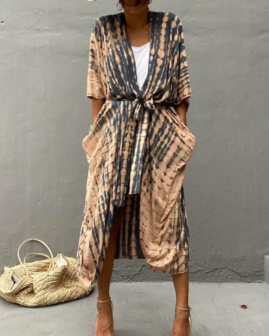 Tie-Dye Print Pocket Front Irregular Hem Long Kimono Coat